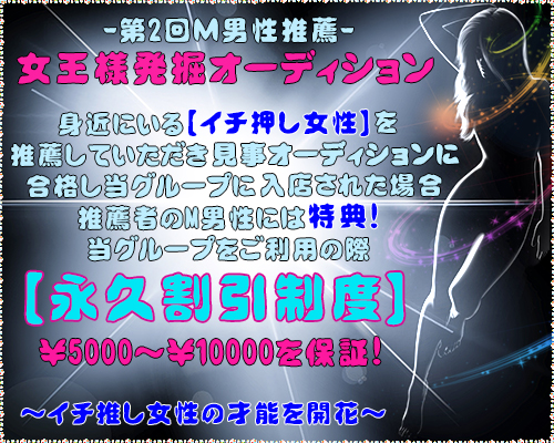 M男性様ならではの五感を活かし、身近に居る女性を女王様に推薦!!見事合格した場合、推薦者様には「永久割引制度」※詳細は特設ページを御覧下さいませ。